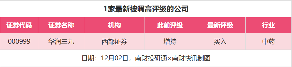評(píng)級(jí)調(diào)高方面,12月2日,券商調(diào)高上市公司評(píng)級(jí)達(dá)到1家次,最新數(shù)據(jù)包括了西部證券(002673)對(duì)華潤(rùn)三九(000999)的評(píng)級(jí)從“增持”調(diào)高至“買入”。