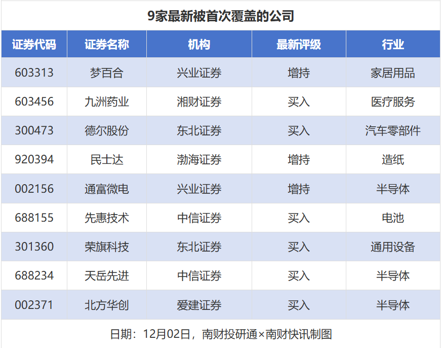 首次覆蓋方面,12月2日券商共給出了9次首次覆蓋,其中夢(mèng)百合、通富微電(002156)獲得興業(yè)證券分別給予“增持”“增持”評(píng)級(jí),九洲藥業(yè)獲得湘財(cái)證券給予“買入”評(píng)級(jí),德爾股份獲得東北證券給予“買入”評(píng)級(jí),民士達(dá)獲得渤海證券給予“增持”評(píng)級(jí)。