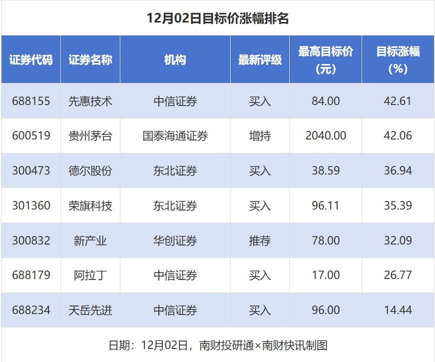 南財(cái)投研通數(shù)據(jù)顯示,12月2日,券商給予上市公司目標(biāo)價(jià)共7次,按最新收盤價(jià)計(jì)算,目標(biāo)價(jià)漲幅排名居前的公司有先惠技術(shù)、貴州茅臺(tái)(600519)、德爾股份(300473),目標(biāo)價(jià)漲幅分別為42.61%、42.06%、36.94%,分別屬于電池、白酒、汽車零部件行業(yè)。