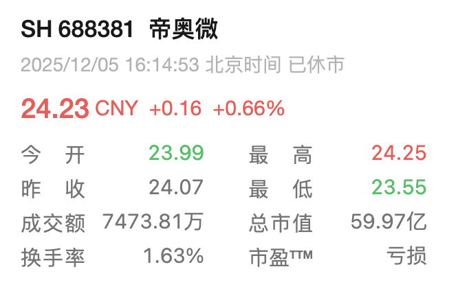 二級市場上,截至12月5日收盤,帝奧微上漲0.66%報24.23元/股,總市值約59.97億元。