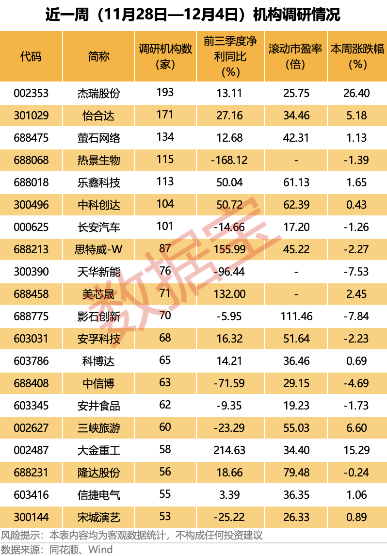 人民財(cái)訊12月7日電,近一周(11月28日—12月4日)機(jī)構(gòu)調(diào)研個(gè)股有380多只,杰瑞股份(002353)調(diào)研機(jī)構(gòu)數(shù)最多。杰瑞股份有193家機(jī)構(gòu)調(diào)研,其中包括57家基金公司、48家證券公司、29家私募、13家保險(xiǎn)公司以及16家海外機(jī)構(gòu)。