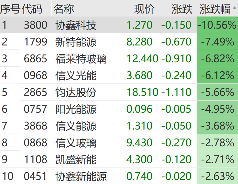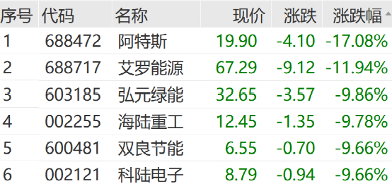 阿斯特大跌17%,艾羅能源跌近12%,海陸重工(002255)、弘元綠能(603185)、雙良節(jié)能(600481)等多股接近跌停。
