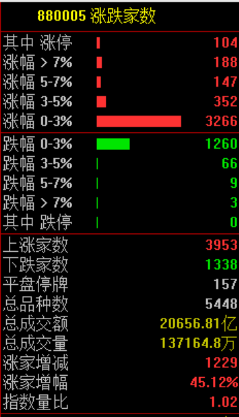 全市場共有3953只個股上漲,104只個股漲停,1338只個股下跌,無個股跌停。