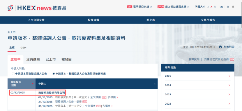 回顧南華期貨本次港股IPO的申請過程,今年4月17日,南華期貨向香港聯(lián)合交易所遞交了發(fā)行上市的申請,于同日在香港聯(lián)合交易所網(wǎng)站刊登了本次發(fā)行并上市的申請資料。根據(jù)本次發(fā)行上市計劃及香港聯(lián)合交易所的相關規(guī)定,公司于2025年10月31日向香港聯(lián)合交易所更新遞交本次發(fā)行上市的申請,并于同日在香港聯(lián)合交易所網(wǎng)站刊登了本次發(fā)行上市的更新申請材料。