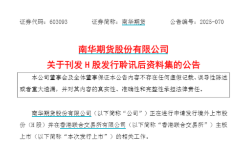 12月2日,南華期貨(603093)就“刊發(fā)H股發(fā)行聆訊后資料集”發(fā)布公告,港交所網(wǎng)站也更新相關(guān)信息,意味著該公司已通過(guò)聯(lián)交所IPO聆訊,將進(jìn)入港股發(fā)行上市階段。