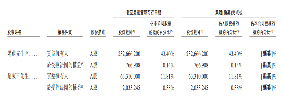 公司由陽先生及賀女士分別持有43.40%及3.64%的股權。陽先生和賀女士為一致行動人。因此,陽先生及賀女士為公司的控股股東。