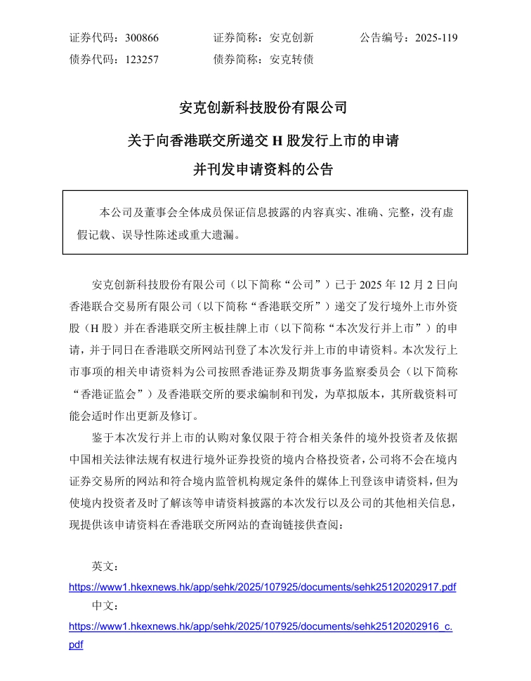 IT之家12月5日消息,安克創(chuàng)新(300866)12月3日發(fā)布公告,已于2025年12月2日向香港聯(lián)合交易所有限公司遞交了發(fā)行境外上市外資股(H股)并在香港聯(lián)交所主板掛牌上市的申請,并于同日在香港聯(lián)交所網(wǎng)站刊登了本次發(fā)行并上市的申請資料。