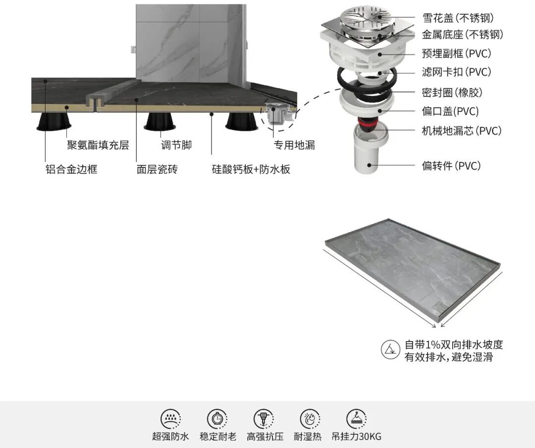 裝配式衛(wèi)浴系統(tǒng)采用聚氨酯防水底盒與科巖瓷磚復(fù)合墻板,結(jié)合工廠預(yù)制水管配件,構(gòu)成高效集成的裝配式整體衛(wèi)浴,通過封閉式防水底盤技術(shù)及一體式復(fù)合墻板插接技術(shù),構(gòu)成“零滲漏”的衛(wèi)浴防水體系。其中,防水底盤自帶的1%雙向排水坡度,解決了衛(wèi)生間“滲漏水”這一大頑疾,做到極速排水,確!安宦、“不堵”,這正是"預(yù)防優(yōu)于治理"理念的最佳實(shí)踐——通過系統(tǒng)化設(shè)計(jì),將傳統(tǒng)裝修中的維修難點(diǎn)轉(zhuǎn)化為可靠承諾。