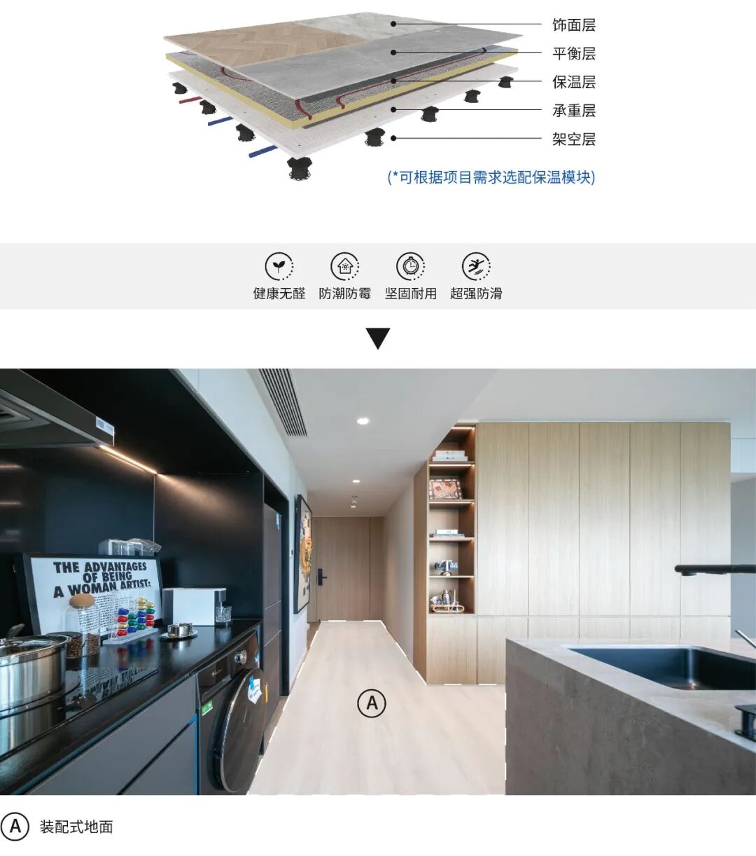 裝配式地面系統(tǒng)采用琉晶架空地面產(chǎn)品,由金屬調(diào)節(jié)腳、管線空腔集成和超強(qiáng)承重硫氧鎂基板構(gòu)成。該系統(tǒng)采用雙層承重基本復(fù)合結(jié)構(gòu)和彈性減震構(gòu)件,面層增設(shè)靜音墊,改善樓板撞擊聲達(dá)20dB,結(jié)合分戶墻、門窗洞口、幕墻連接、排水管等細(xì)部的隔聲結(jié)構(gòu)設(shè)計(jì),創(chuàng)造"不吵"的靜謐環(huán)境。除此之外,該產(chǎn)品還具備高強(qiáng)承重、安裝快捷、減震降噪、便于維修等多重優(yōu)勢,這些卓越性能共同構(gòu)筑了堅(jiān)實(shí)耐用的地面系統(tǒng),為項(xiàng)目打造高品質(zhì)居裝配式地面系統(tǒng)采用琉晶架空地面產(chǎn)品,由金屬調(diào)節(jié)腳、管線空腔集成和超強(qiáng)承重硫氧鎂基板構(gòu)成。該系統(tǒng)采用雙層承重基本復(fù)合結(jié)構(gòu)和彈性減震構(gòu)件,面層增設(shè)靜音墊,改善樓板撞擊聲達(dá)20dB,結(jié)合分戶墻、門窗洞口、幕墻連接、排水管等細(xì)部的隔聲結(jié)構(gòu)設(shè)計(jì),創(chuàng)造"不吵"的靜謐環(huán)境。除此之外,該產(chǎn)品還具備高強(qiáng)承重、安裝快捷、減震降噪、便于維修等多重優(yōu)勢,這些卓越性能共同構(gòu)筑了堅(jiān)實(shí)耐用的地面系統(tǒng),為項(xiàng)目打造高品質(zhì)居住體驗(yàn)提供了堅(jiān)實(shí)的技術(shù)保障,更體現(xiàn)了亞廈工業(yè)化對(duì)居住者心理感受的深度關(guān)注——控制噪音分貝的同時(shí),致力于營造寧靜舒適的生活氛圍。住體驗(yàn)提供了堅(jiān)實(shí)的技術(shù)保障,更體現(xiàn)了亞廈工業(yè)化對(duì)居住者心理感受的深度關(guān)注——控制噪音分貝的同時(shí),致力于營造寧靜舒適的生活氛圍。