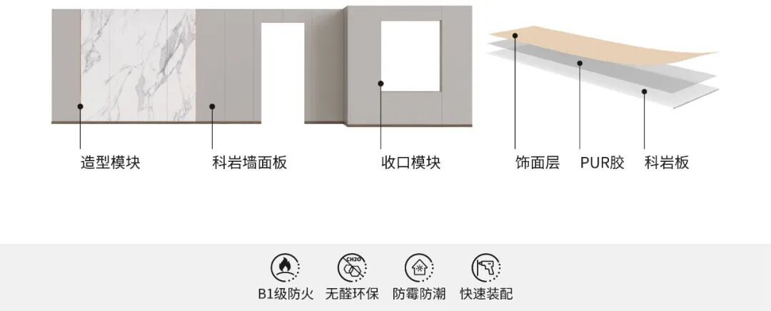 裝配式墻面系統(tǒng)采用科巖墻面板,以高分子聚合樹脂為主料,提供天然防水結(jié)構(gòu),以無機(jī)礦粉為填料,經(jīng)過高溫塑化及連續(xù)擠壓工藝形成均勻致密結(jié)構(gòu),物理阻隔水分滲透,具有防霉防潮、健康無醛、耐磨耐刮的特性,真正實(shí)現(xiàn)"不霉"的效果。此外,墻板采用模塊式拼接結(jié)構(gòu),能夠吸收一定范圍內(nèi)的墻體變形,確保墻面"不裂",這種新型材料與結(jié)構(gòu)的結(jié)合,讓"耐久性"從承諾變?yōu)榭筛兄钠焚|(zhì)。