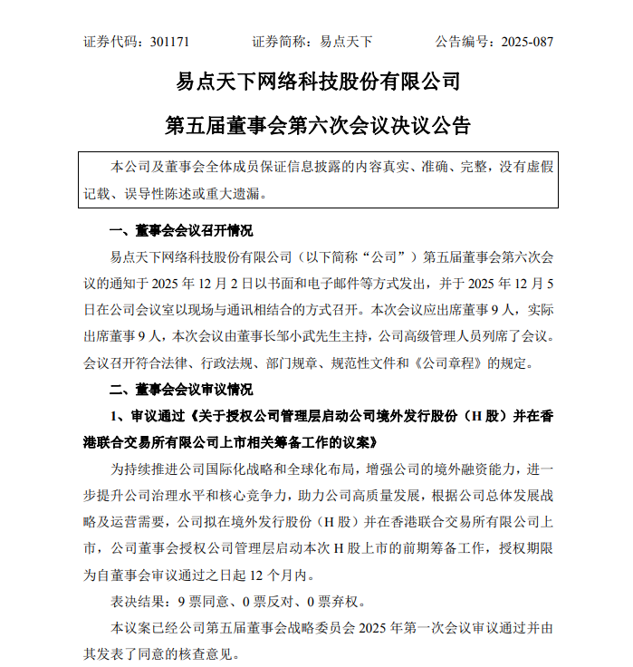 12月5日,易點天下(301171)(301171.SZ)公告稱,公司董事會授權(quán)管理層啟動H股上市的前期籌備工作,旨在推進國際化戰(zhàn)略、增強境外融資能力、提升公司治理水平和核心競爭力。授權(quán)期限為自董事會審議通過之日起12個月內(nèi)。