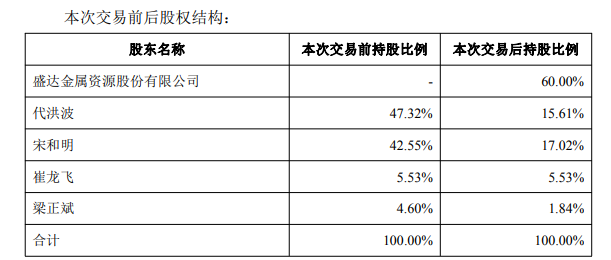 12月8日,盛達資源(000603)(000603.SZ)公告稱,公司擬以現(xiàn)金5億元收購代洪波、宋和明、梁正斌合計持有的伊春金石礦業(yè)有限責(zé)任公司60%股權(quán)。其中,擬以226,425.00萬元收購代洪波持有的金石礦業(yè)31.71%股權(quán),以21,275.00萬元收購宋和明持有的金石礦業(yè)25.53%股權(quán),以2,300.00萬元收購梁正斌持有的金石礦業(yè)2.76%股權(quán)。本次交易完成后,金石礦業(yè)將成為公司的控股子公司。