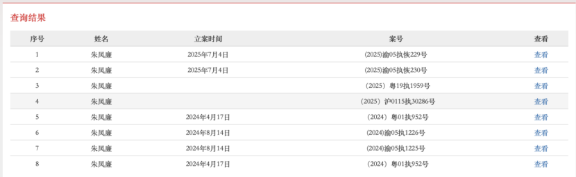以今年新立案的執(zhí)行案件來看,朱鳳廉在重慶市第五中級人民法院涉及2筆執(zhí)行,標的金額分別為2.24億元、1.01億元;她在上海市浦東新區(qū)人民法院有1筆執(zhí)行,涉及金額為2058.80萬元。