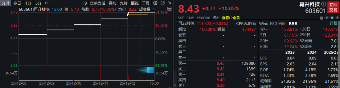 12日,本周“連板牛股”再升科技(603601)今日高開后震蕩上揚(yáng),用時(shí)不到10分鐘就封住漲停,拿下“五連板”的同時(shí)股價(jià)創(chuàng)近三年新高。