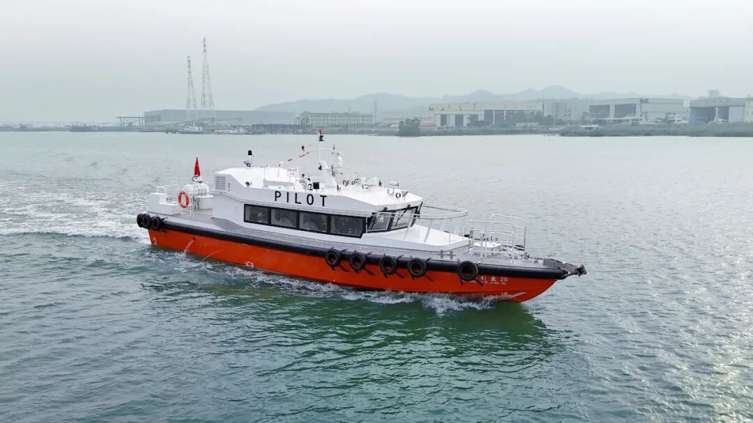 針對(duì)上海港引航作業(yè)的高要求,江龍船艇打造的“滬港引交25”與“滬港引交26”兩艘新型鋁合金引航艇同樣表現(xiàn)亮眼。作為繼“滬港引交23”圓滿交付后的再度合作成果,此次試航的引航艇采用深V型單體高速船型設(shè)計(jì),全鋁合金結(jié)構(gòu)不僅有效降低船體自重,更兼具優(yōu)異的抗風(fēng)浪能力與操縱穩(wěn)定性。該艇總長18米、型寬4.6米,型深2.0米,吃水0.8米,雙機(jī)雙槳推進(jìn)系統(tǒng),航速高達(dá)24.3節(jié),可滿足上海港復(fù)雜水文條件下的快速引航交通需求。試航期間,船舶的航速、轉(zhuǎn)向、穩(wěn)性等關(guān)鍵指標(biāo)均通過嚴(yán)格檢驗(yàn),得到了上海港引航站相關(guān)負(fù)責(zé)人的高度認(rèn)可。