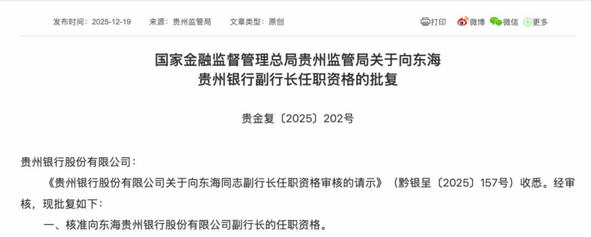 12月19日,國家金融監(jiān)督管理總局貴州監(jiān)管局發(fā)布多條批復(fù),同意貴州銀行一名副行長、兩名獨(dú)立董事、一名董事的任職資格,包括副行長向東海,獨(dú)立董事許亮、張俊杰,董事張硯。