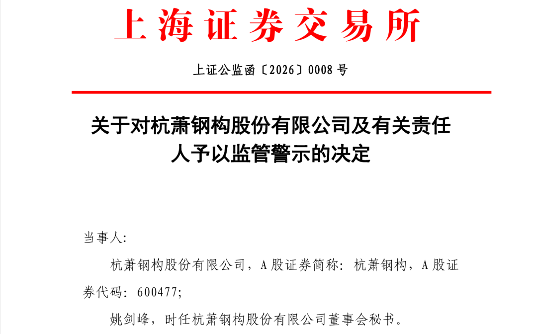 鑒于上述違規(guī)事實(shí)和情節(jié),根據(jù)有關(guān)規(guī)定,上交所作出如下監(jiān)管措施決定:對(duì)杭蕭鋼構(gòu)股份有限公司及時(shí)任董事會(huì)秘書(shū)姚劍峰予以監(jiān)管警示。