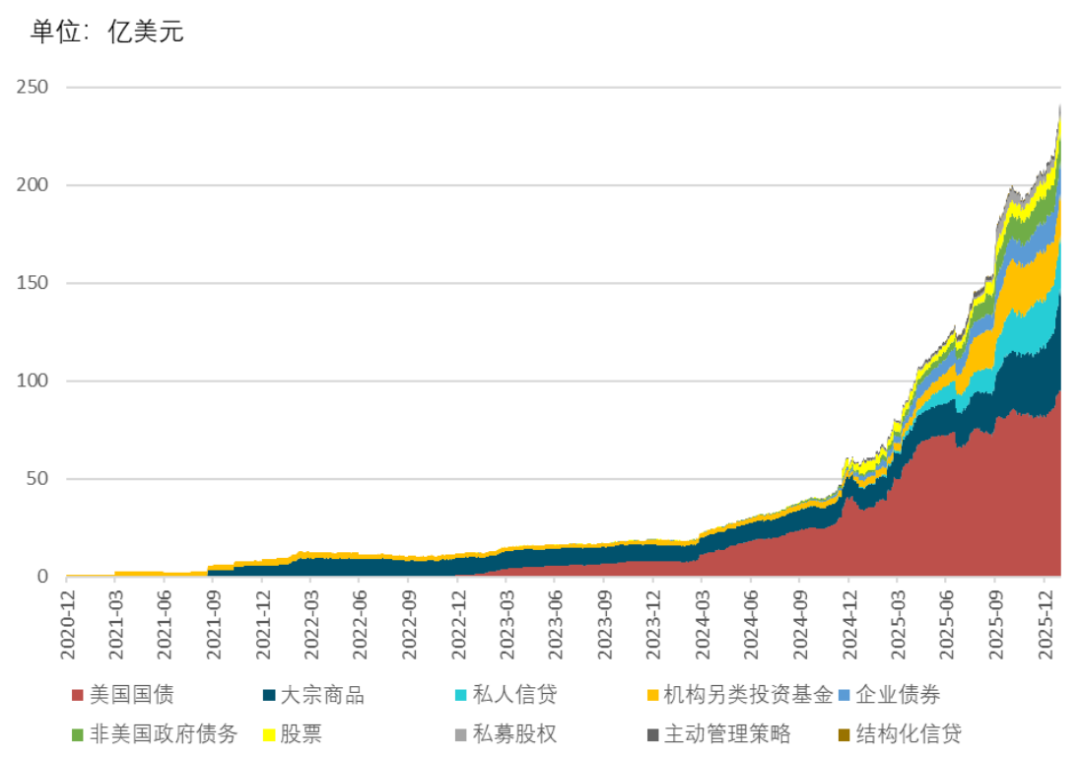 國際方面,根據(jù)RWA.xyz統(tǒng)計,截至2026年1月31日,RWA總市值約237億美元,較2025年三季度末的168億美元增長41.1%。根據(jù)其底層資產(chǎn)劃分(如圖3所示),美國國債RWA占比最高,為40.0%,市值約94.9億美元;其次為大宗商品RWA,市值47.4億美元,占比20.0%;其余底層資產(chǎn)及其RWA市值占比為:私人信貸11.5%、機構(gòu)另類投資基金9.1%、企業(yè)債券6.8%、非美國政府債務(wù)6.1%、股票4.0%、私募股權(quán)1.5%,其余主動管理策略和結(jié)構(gòu)化信貸均不足1%。