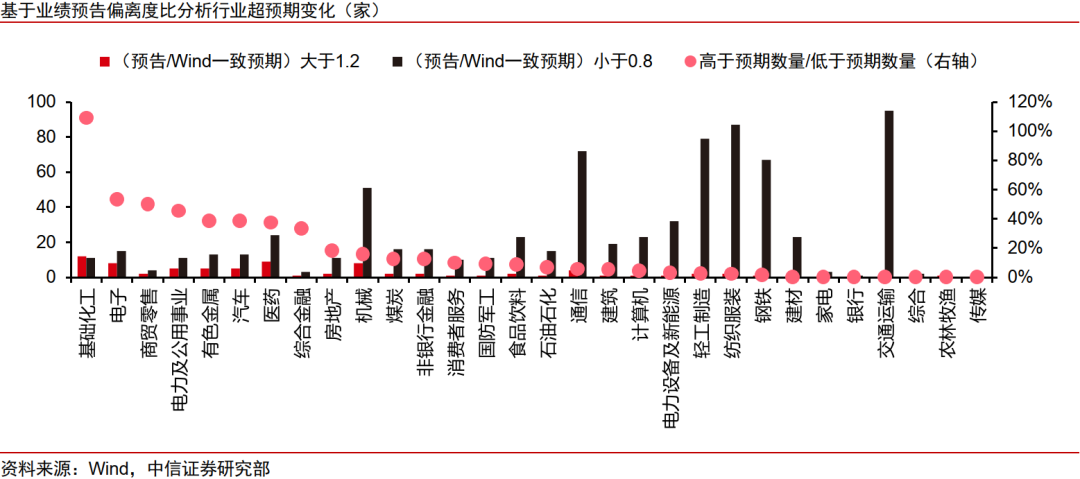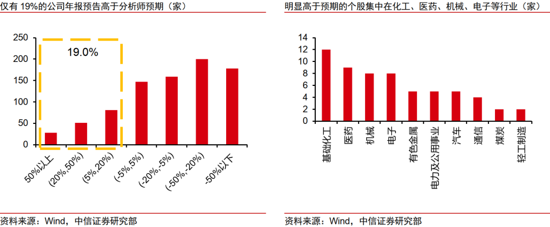 1)本輪年報預告中分析師預期總體偏樂觀。計算預告凈利潤中值相對于市場一致預期的偏離度,結(jié)果顯示,業(yè)績低于分析師預期(低于-5%)的公司數(shù)量高達537家,而高于預期(高于5%)的公司僅為160家,前者是后者的3.4倍。這一懸殊比例強烈表明,分析師在本期的盈利預測整體偏樂觀?;A化工(850102)、電子、醫(yī)藥、有色金屬(1B0819)、機械等行業(yè)超預期個股數(shù)量領先,汽車與電力(562350)及公用事業(yè)超預期公司數(shù)量與占比排名上均較為靠前。