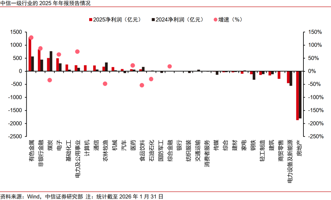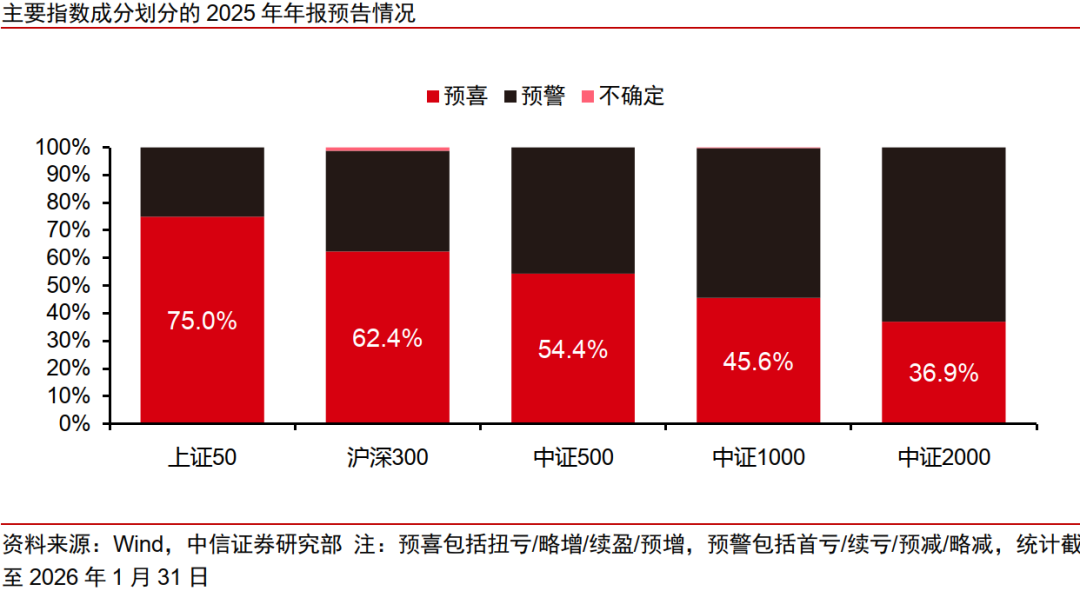 3)本輪業(yè)績預告呈現(xiàn)出“科技驅(qū)動、外需支撐、金融壓倉”的結(jié)構(gòu)性特征。截至2026年1月31日,共有9家上證50(1B0016)成分股發(fā)布業(yè)績預告,6家實現(xiàn)業(yè)績增長的企業(yè)分別來自機械、有色、醫(yī)藥和電子行業(yè),其中有4家企業(yè)境外收入占比超過40%,另外2家企業(yè)增長來自于半導體設備(884229)國產(chǎn)化與AI驅(qū)動的資本開支。共有89家滬深300(399300)成分股發(fā)布年報預告,在實現(xiàn)增長的58家中有20家境外業(yè)務收入占比超過30%。受益于全球AI基建和半導體(881121)需求增長,科技行業(yè)整體彈性較高。在中國制造業(yè)定價權(quán)重估背景下,有色、化工(850102)、機械等行業(yè)也迎來業(yè)績釋放。最后,受益于國內(nèi)資本市場繁榮,本輪業(yè)績預告中非銀金融板塊也具有亮眼表現(xiàn)。