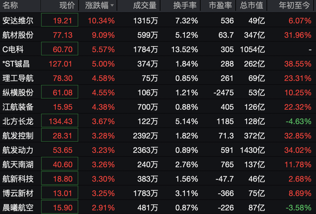 航天軍工(885700)板塊拉升反彈,安達(dá)維爾(300719)、航材股份(688563)、理工導(dǎo)航(688282)等漲幅居前。