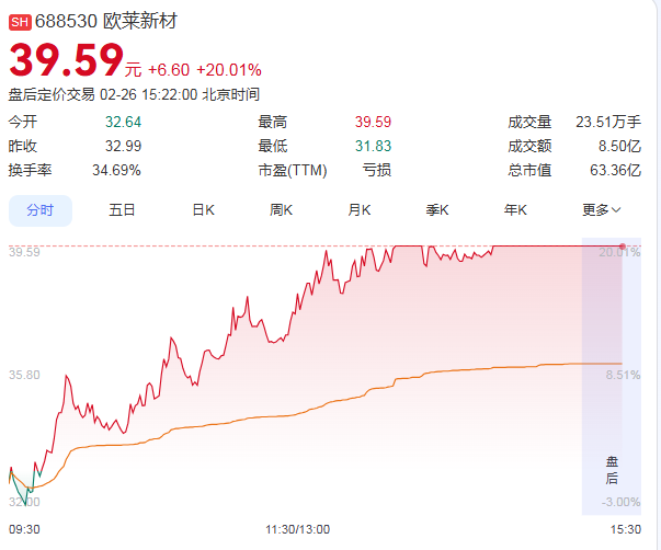 2月26日,歐萊新材(688530)強(qiáng)勢漲停,收盤價為39.59元,成交額為8.50億元,總市值攀升至63.36億元。據(jù)統(tǒng)計,自2026年1月27日以來的17個交易日內(nèi),歐萊新材(688530)股價累計漲幅超過112%,表現(xiàn)非常亮眼。