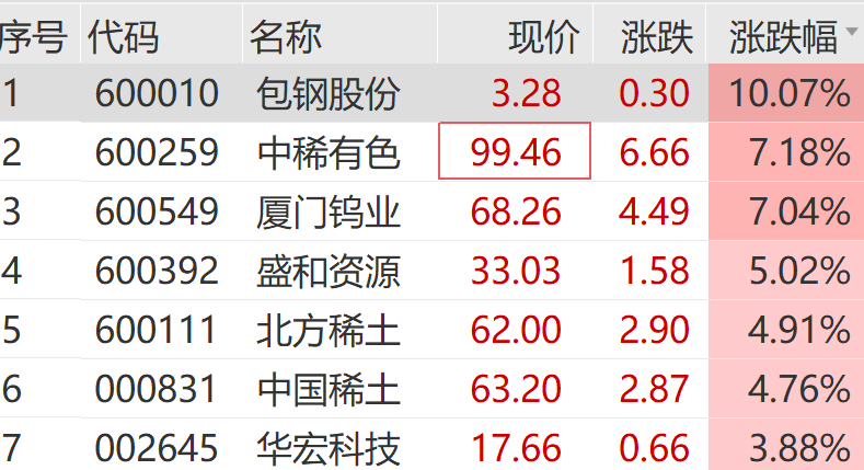 稀土(884215)概念股火熱,包鋼股份(600010)盤中觸及漲停,中稀有色(600259)、中國稀土(000831)、北方稀土(600111)紛紛走強。