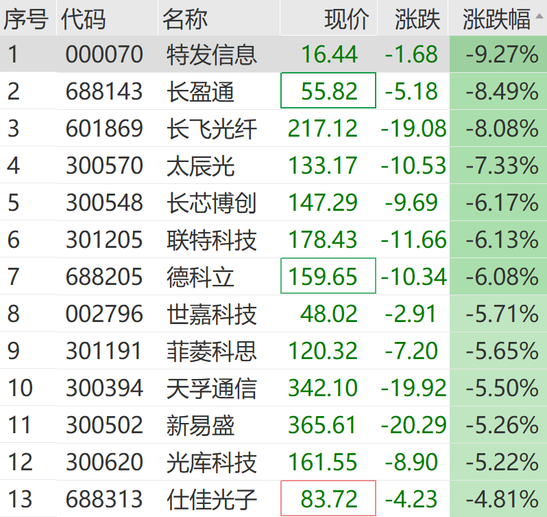個股方面,特發(fā)信息(000070)、長飛光纖(601869)、太辰光(300570)、德科立(688205)、天孚通信(300394)、新易盛(300502)等紛紛走低。