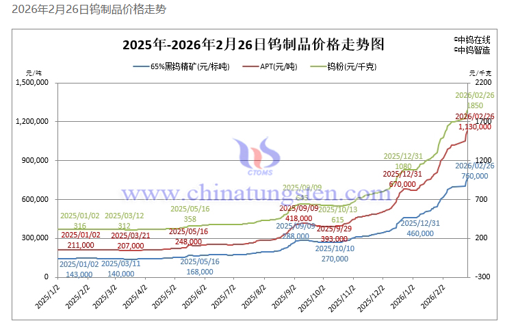 行業(yè)層面,鎢價持續(xù)走高。據(jù)中鎢在線數(shù)據(jù)統(tǒng)計,截至2月26日,鎢粉價格報1850元/公斤,較年初漲71.3%。65%黑鎢精礦價格報76萬元/標(biāo)噸,較年初漲65.2%。仲鎢酸銨(APT)價格報113萬元/噸,較年初漲68.7%。