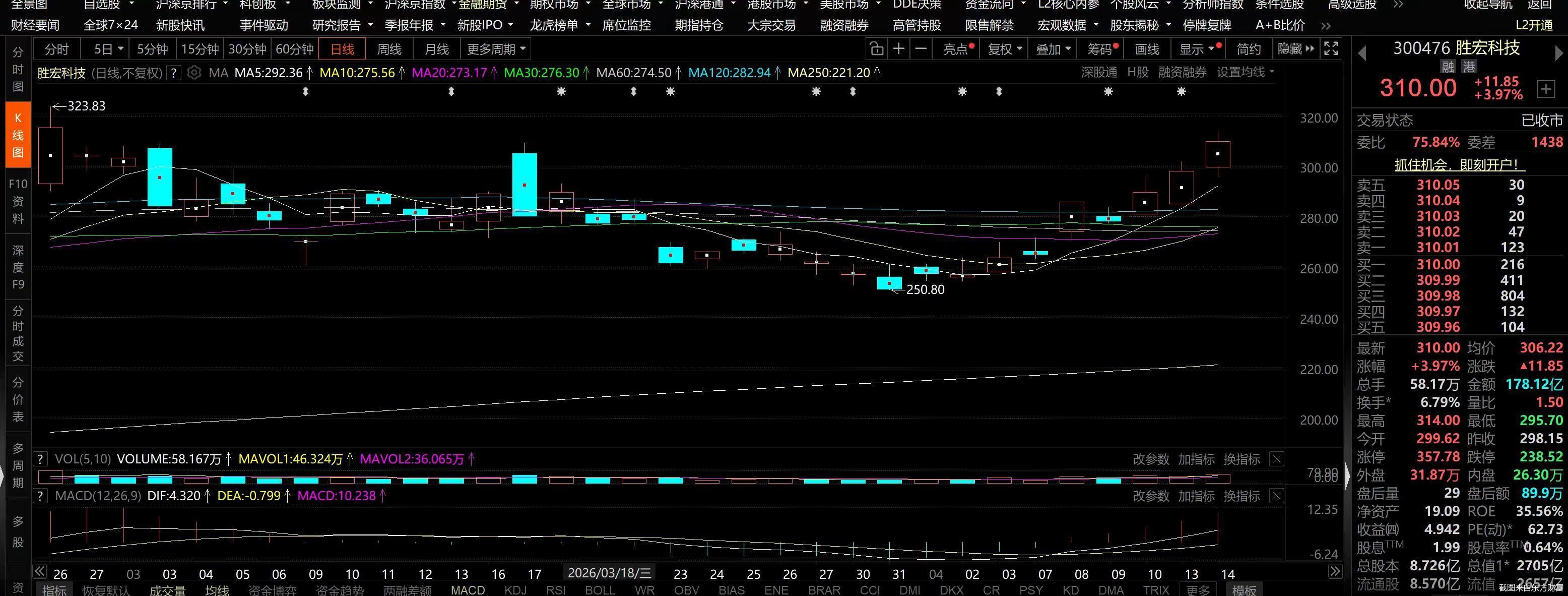 二級市場方面,截至4月14日收盤,勝宏科技(300476)股價(jià)報(bào)310元/股,總市值2705億元。拉長時(shí)間來看,3月31日—4月14日這10個(gè)交易日內(nèi),公司股價(jià)接連震蕩上行,區(qū)間累計(jì)漲幅20.49%。