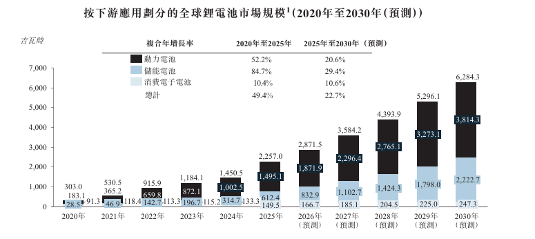 2020年至2025年,全球鋰電池(884309)市場經(jīng)歷了快速增長,市場規(guī)模從2020年的約303.0吉瓦時擴大至 2025年的2,257.0吉瓦時,期內(nèi)復(fù)合年增長率為49.4%。