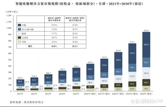 據(jù)弗若斯特沙利文報(bào)告,在智能化與電動化深化、車企加速座艙智能化標(biāo)配的驅(qū)動下,全球智能座艙(886059)解決方案市場規(guī)模從2021年1858億元增至2025年3705億元,復(fù)合增速18.8%;預(yù)計(jì)2030年達(dá)9350億元,20252030年復(fù)合增速20.3%。市場增長主要來自消費(fèi)(883434)體驗(yàn)升級、車企品牌溢價(jià)投入加大,以及高性能SoC芯片成本下降推動域控滲透率提升。區(qū)域上,中國是全球最大、增速最快的智能座艙(886059)市場,2025年占全球41.5%。亞太(除中國)、歐洲、北美市場亦穩(wěn)步增長。