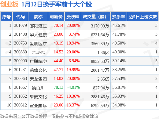 1月12日創(chuàng)業(yè)板換手率前十大個(gè)股,邵陽(yáng)液壓居首