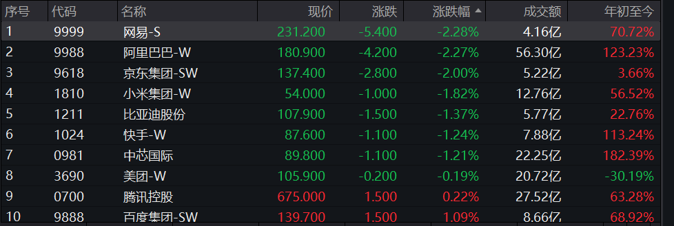 港股科技龍頭股中,網(wǎng)易、阿里巴巴和京東集團(tuán)分別下跌2.28%、2.27%和2%,小米集團(tuán)和快手跌幅也在1%以上。百度集團(tuán)和騰訊控股收紅,分別上漲1.09%和0.22%。