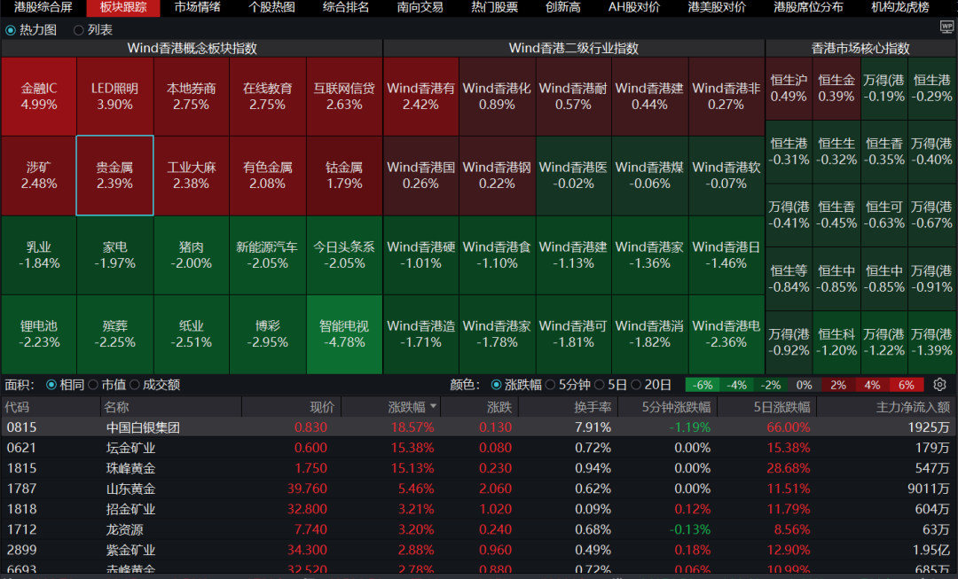 在波動(dòng)中,港股市場也有亮點(diǎn)。板塊中,貴金屬漲幅居前,上漲2.39%。其中,中國白銀集團(tuán)上漲18.57%,壇金礦業(yè)和珠峰黃金漲幅也分別高達(dá)15.38%和15.13%,山東黃金(600547)、招金礦業(yè)等個(gè)股漲幅居前。