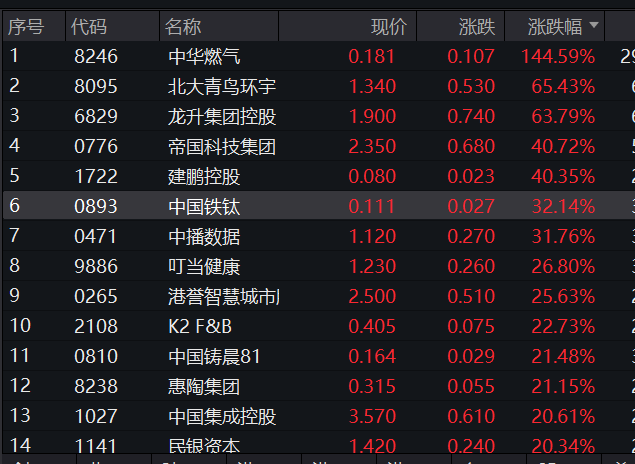 此外,中華燃?xì)?08246.HK)一度大漲超300%,截至早盤收盤,該股仍漲144.59%,股價(jià)報(bào)0.181港元/股。該公司此前公告稱,公司10月3日(交易時(shí)段后)與認(rèn)購人訂立認(rèn)購協(xié)議,認(rèn)購人有條件同意認(rèn)購而公司有條件同意配發(fā)及發(fā)行合共3.34億股認(rèn)購股份,認(rèn)購價(jià)為每股0.075港元。據(jù)悉,這一認(rèn)購價(jià)較10月3日收盤價(jià)每股0.074港元溢價(jià)約1.35%。北大青鳥環(huán)宇和龍升集團(tuán)控股漲幅也分別達(dá)65.43%和63.79%。