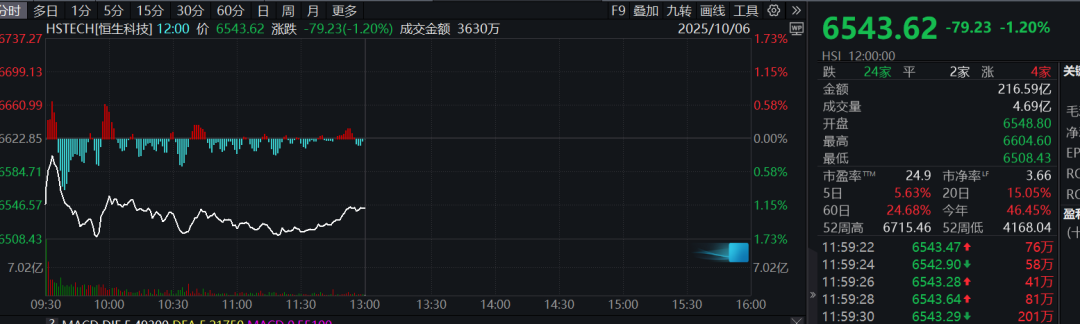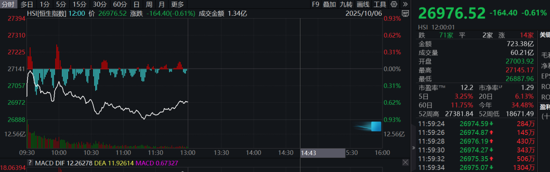 10月6日,港股繼續(xù)調(diào)整。恒生指數(shù)低開后震蕩走低,盤中最大跌幅一度達(dá)0.93%,隨后有所反彈。截至早盤收盤,恒生指數(shù)報(bào)收26976.52點(diǎn),下跌0.61%。恒生科技指數(shù)延續(xù)類似走勢(shì),截至早盤收盤,跌幅為1.2%。