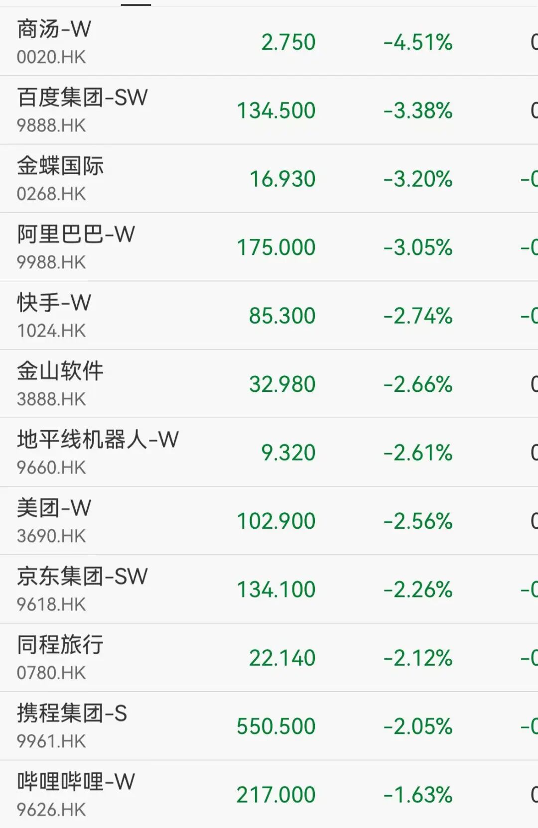 商湯跌超4%,阿里、百度跌超3%,金山軟件、京東跌超2%。