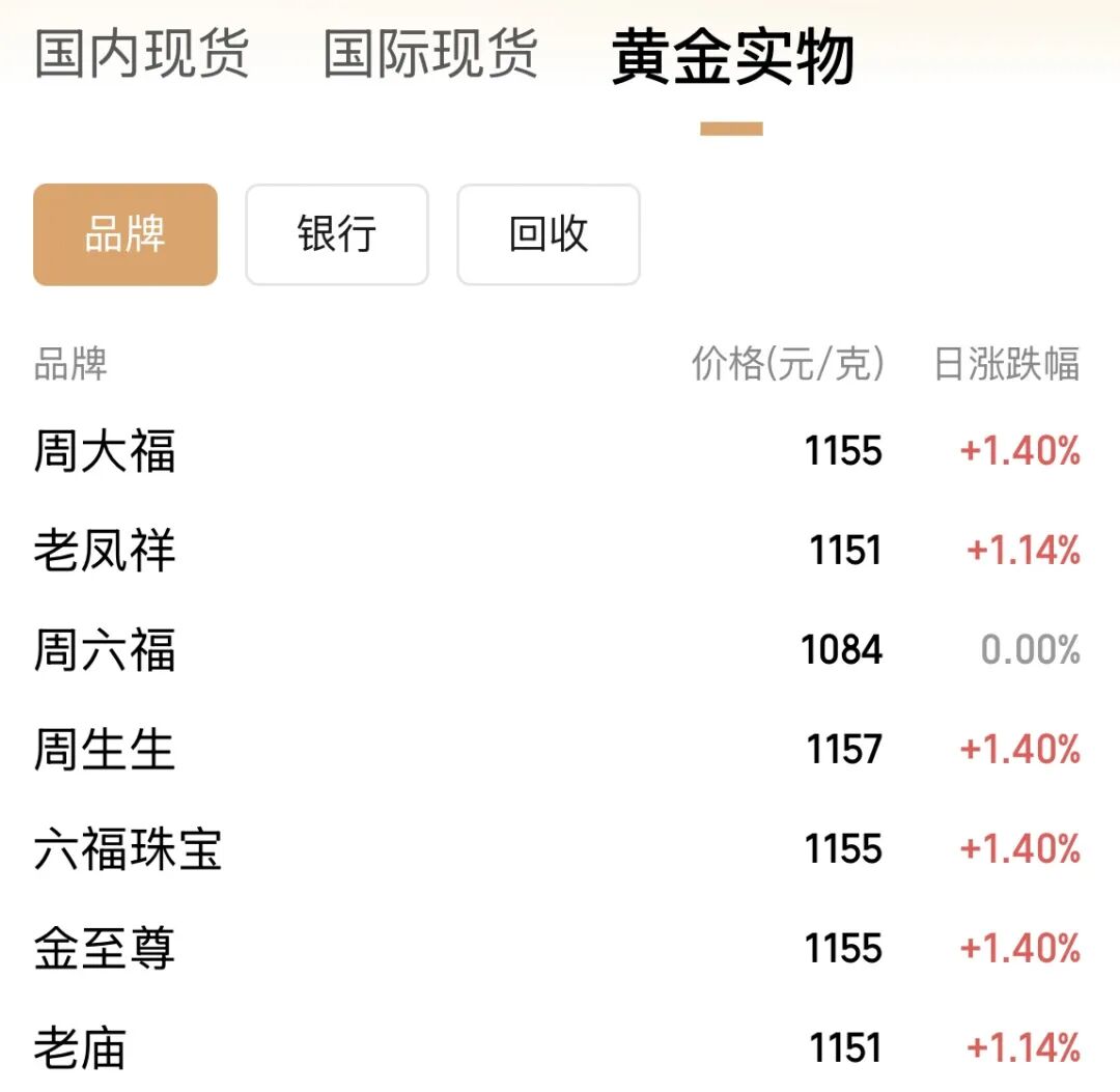 國內(nèi)多家黃金珠寶品牌金飾價(jià)格持續(xù)攀升,周生生足金飾品漲至1157元/克,周大福、六福珠寶、金至尊足金飾品漲至1155元/克。