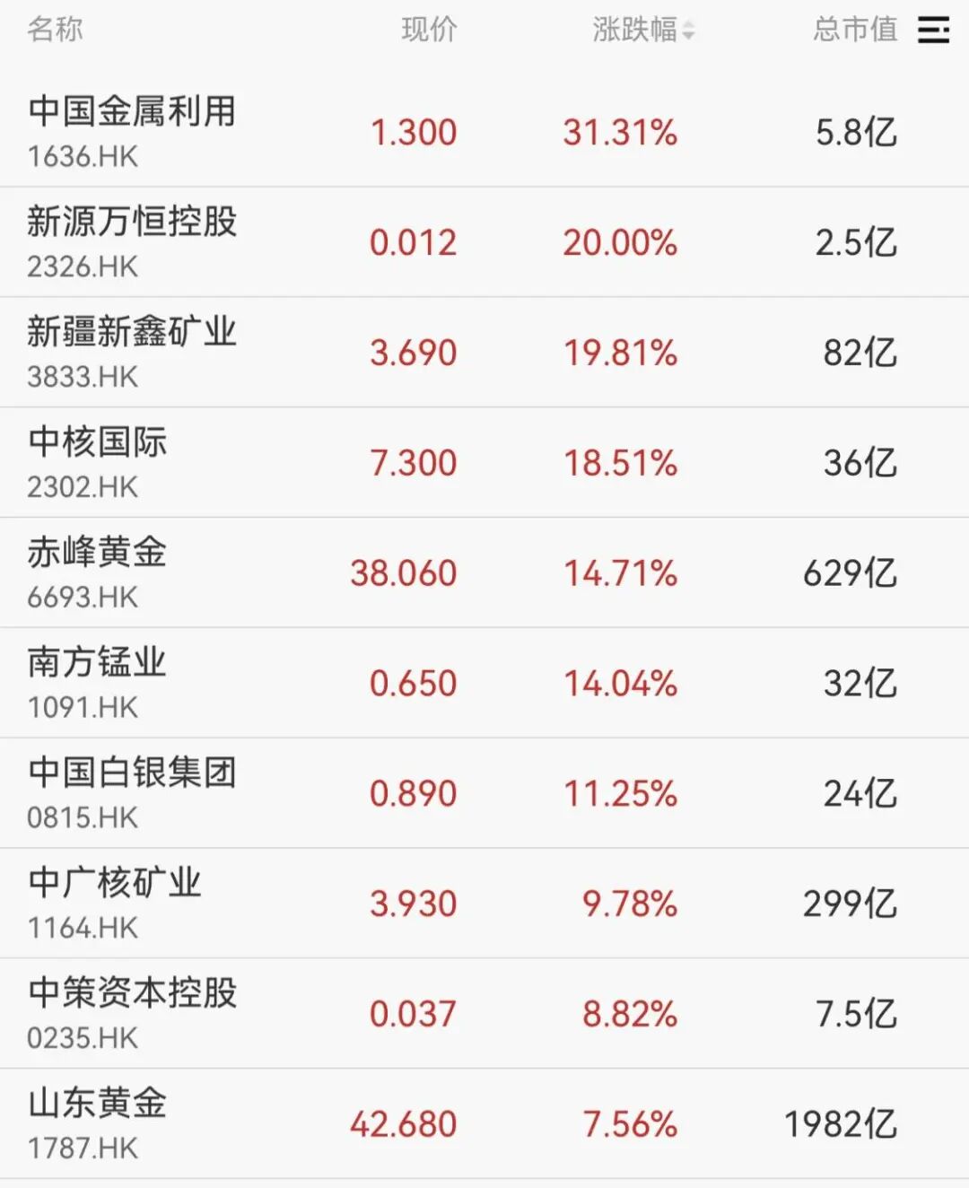 受益于黃金價(jià)格走高,貴金屬板塊持續(xù)大漲,中國金屬利用漲超30%,新疆新鑫礦業(yè)、赤峰黃金(600988)、山東黃金(600547)等多股大漲。