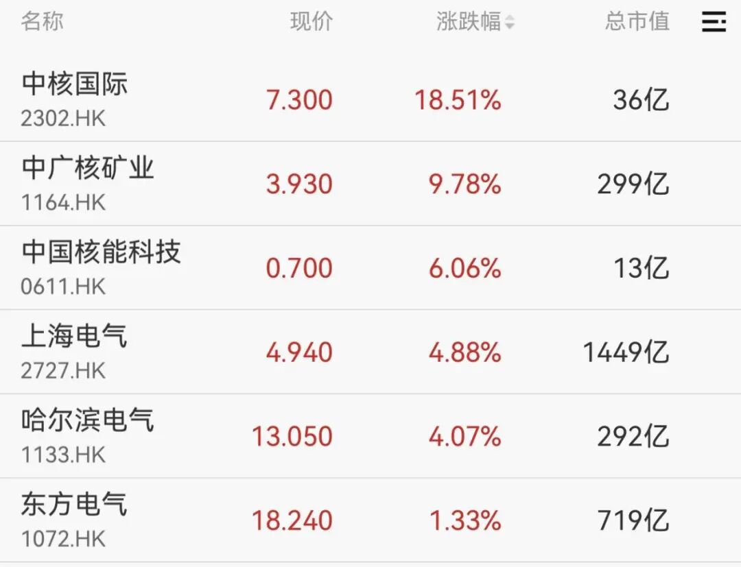 港股核電板塊走強(qiáng),中核國際一度大漲20%,中廣核礦業(yè)漲超9%,上海電氣(601727)、哈爾濱電氣、東方電氣(600875)等跟漲。