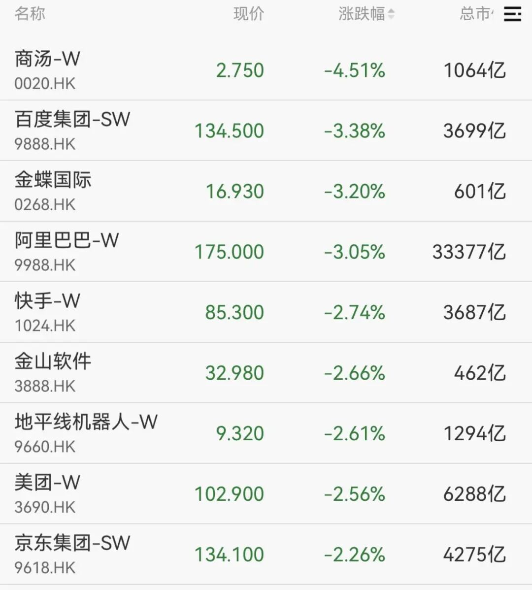 個(gè)股方面,商湯跌超4%,百度集團(tuán)、阿里巴巴、快手等跌幅居前。