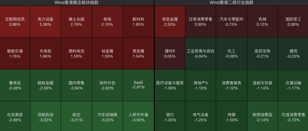 板塊上來看,港股核電板塊走強(qiáng),貴金屬概念股集體大漲,鋰電池、汽車及其產(chǎn)業(yè)鏈板塊表現(xiàn)活躍;半導(dǎo)體、可選消費(fèi)、房地產(chǎn)等板塊震蕩調(diào)整。