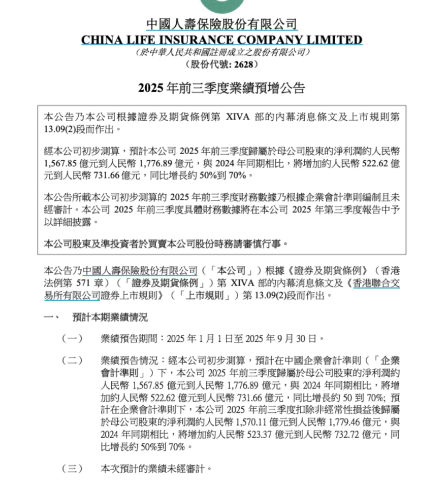 10月21日,中國人壽(601628)收漲6.06%。消息面上,10月19日,中國人壽發(fā)布盈利預(yù)增公告顯示,在中國企業(yè)會計準則下,該公司2025年前三季度歸屬于母公司股東的凈利潤約人民幣1567.85億元到人民幣1776.89億元,同比增長約50%至70%;預(yù)計在中國企業(yè)會計準則下,該公司2025年前三個季度扣除非經(jīng)常性損益后歸屬于母公司股東的凈利潤約人民幣1570.11億元到人民幣1779.46億元,同比增長約50%~70%。摩根大通稱中國人壽基本面方面仍有上行空間。