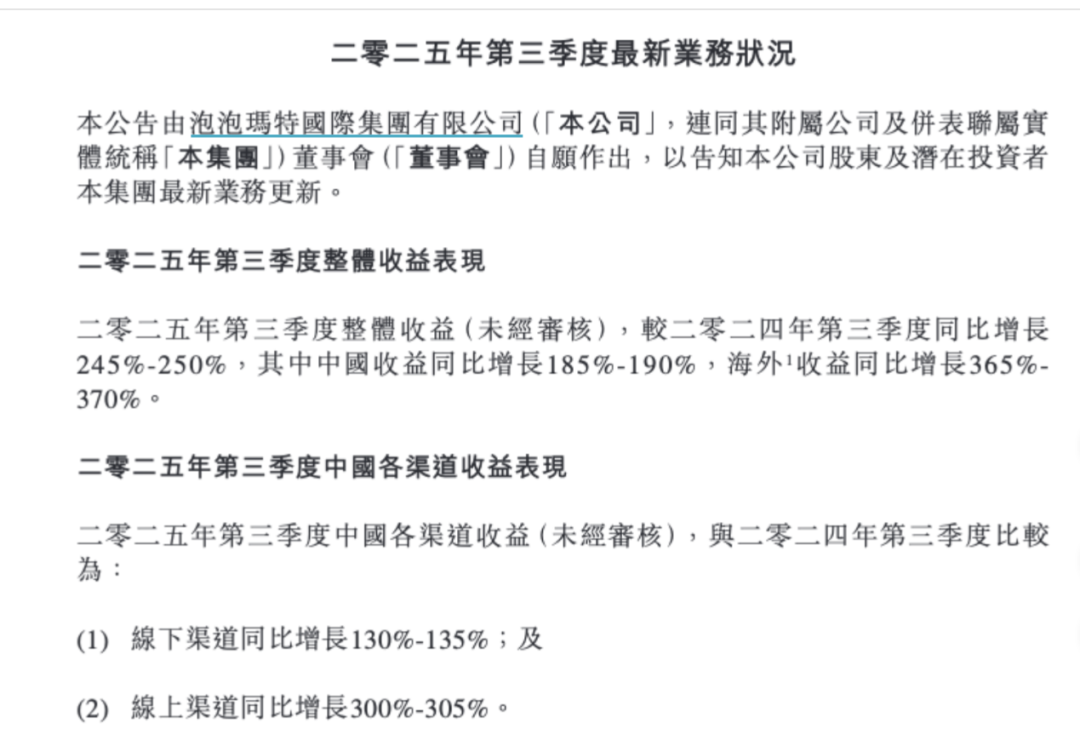 10月21日,泡泡瑪特發(fā)布公告披露2025年三季度最新業(yè)務(wù)情況。公告顯示,泡泡瑪特2025年三季度整體收益(未經(jīng)審核)同比增長245%~250%。其中,中國收益同比增長185%~190%,海外收益同比增長365%~370%。