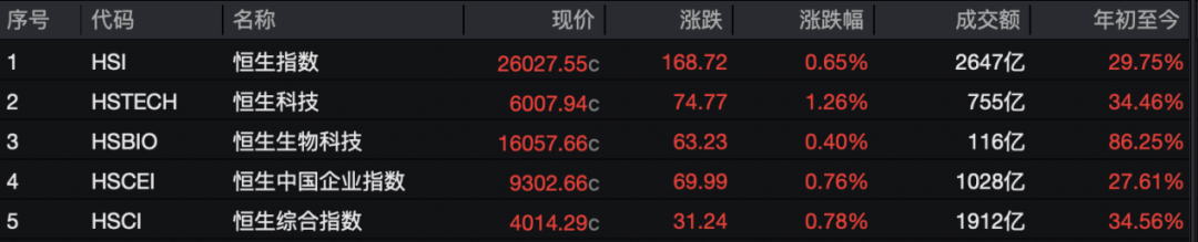 10月21日,港股繼續(xù)強勢上攻。恒生指數(shù)收漲0.65%,報26027.55點;恒生科技指數(shù)收漲1.26%,報6007.94點;恒生中國企業(yè)指數(shù)收漲0.76%,報9302.66點。全日大市成交額為2647億港元,較前一交易日略有回升。南向資金凈流入11.71億港元。