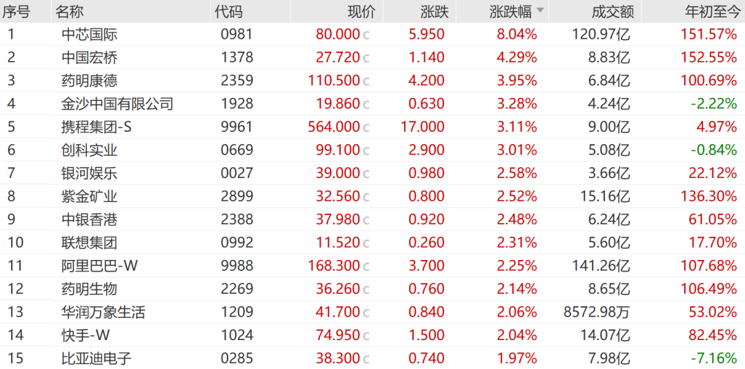 恒生指數(shù)成份股中,61只上漲、22只下跌。中芯國(guó)際漲8.04%,中國(guó)宏橋漲4.29%,藥明康德(603259)上漲3.95%,領(lǐng)漲藍(lán)籌。