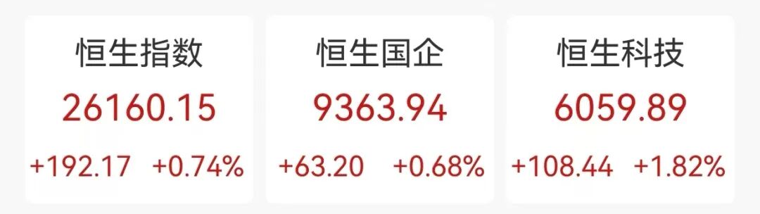 10月24日,香港三大股指全線上漲。香港恒生指數(shù)漲0.74%,報(bào)26160.15點(diǎn),本周漲3.62%;恒生科技指數(shù)漲1.82%,報(bào)6059.89點(diǎn),本周漲5.2%;恒生中國(guó)企業(yè)指數(shù)漲0.68%,報(bào)9363.94點(diǎn),本周漲3.91%。南向資金凈買(mǎi)入32.14億港元。
