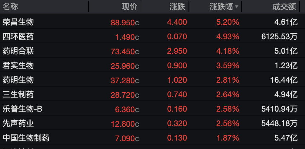 醫(yī)藥板塊同樣受業(yè)績提振而走強。榮昌生物、四環(huán)醫(yī)藥、藥明合聯(lián)分別上漲5.20%、4.93%、4.18%。