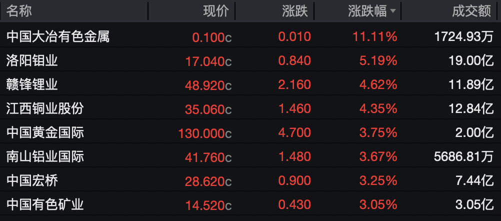 中國大冶有色金屬大漲11.11%、江西銅業(yè)(600362)上漲4.35%。贛鋒鋰業(yè)(002460)、洛陽鉬業(yè)(603993)分別上漲4.62%、5.19%。